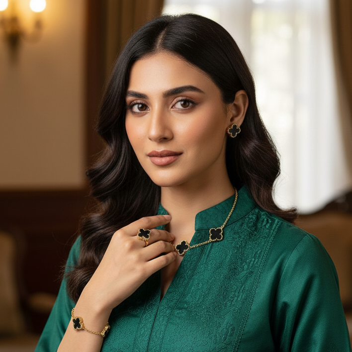 “I recently purchased the clover jewellery set, and I am absolutely thrilled with it! The craftsmanship is beautiful, the quality is excellent, and it looks even more stunning in person than in the pictures. It feels elegant, classy, and perfect for both everyday wear and special occasions. I’ve received so many compliments already! Thank you for providing such a lovely piece—I’m extremely satisfied and highly recommend it to others.
