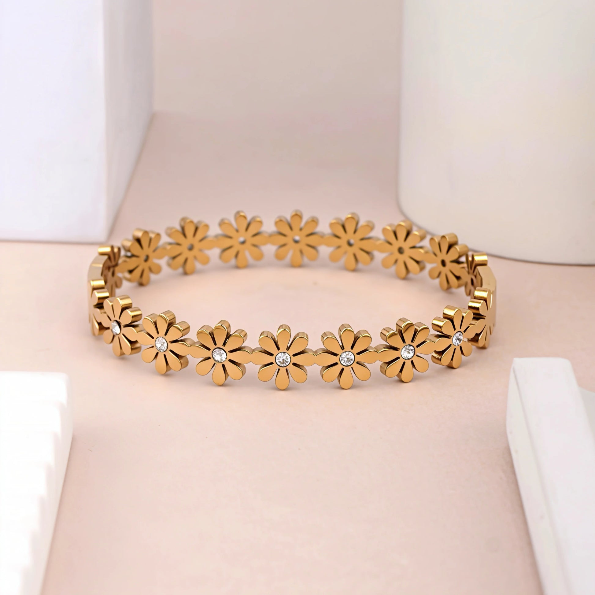 Add a touch of timeless elegance to your jewelry collection with this Floral Sparkle Gold Bracelet. Designed with beautifully crafted flower motifs, each accented with a delicate crystal at the center, this bracelet radiates charm and femininity.