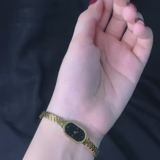 This chic Gold-Plated Watch Style Bangle Bracelet combines the elegance of jewelry with the charm of a timepiece-inspired design. Featuring a sleek black dial face with Roman numeral accents, it’s the perfect fashion accessory to add a touch of sophistication without being a functional watch.