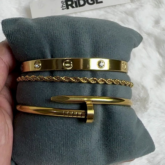 Turn heads with the Golden Luxe Bangle Stack – a statement trio crafted to elevate any outfit. This set features a crystal-studded Cartier-inspired bangle, a twisted rope bracelet, and the bold nail bangle. Together, they bring timeless elegance with a modern edge – perfect for layering or wearing solo.
